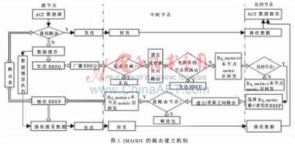 IMAODV在路由请求、路由应答以及路由表中添加metric字段,以记录路径上每个节点的累计路由度量值。当源节点需要通信路由时,先初始化metric为0,再广播这个RREQ包启动路由发现过程。中间节点的路由表段中添加一个rt_metric,记录从源节点到该节点路径上的路径度量最小值,中间节点收到非重复的RREQ包时,将自身的metric值累加到路由RREQ中的rq_metric上,再继续转发。如果节点已经收到了同一源节点相同的广播ID的RREQ,且包的目的序列号大于路由表中序列号,则直接更新路由,若相等就通过比较rq_metric与rt_metric,选较小者作为本路由表项中的rt_metric,即更新路由表项再转发包。当路由请求包到达目的节点时,目的节点将选择一个拥有较小metric的路由,发送路由回复RREP。路由应答是以单播的方式传送,接收到此包的节点时,首先根据接收包中下一跳信息判断本节点是监听节点还是正常的路由应答节点,如下一跳ID不等于本节点ID,则本节点是监听节点,此时记录到目的节点的路由后不再转发,否则是主路径上的节点,则按照传统AODV路由应答的方式进行处理。图3为IMAODV路由建立的流程。