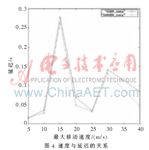 图4显示了端到端延迟与节点移动速度的关系,由此可知IMAODV协议的平均端到端延迟随节点移动速度的增大优于AODV协议,其原因是在路由度量中考虑了每一跳的延迟,且改进的HELLO机制的发送频率与节点移动速度有关,能较快地发现路由断链情况并做出相应处理。图中节点最大速度为5 m/s时,由于处于低速状态,IMAODV优势并不突出,较AODV的延迟大,但是随着节点的移动速度的增加,IMAODV的平均端到端延迟低于AODV;当节点最大移动速度达到40 m/s时,IMAODV的延迟约为AODV延迟的1/2。从总体来看,随着节点移动速度的增加,IMAODV延迟有所下降。
