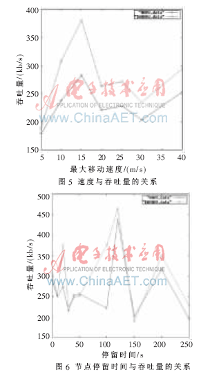仿真工具采用NS-2.30[7]版本,网络的拓扑环境是一个包含50个移动节点的网络模型,节点随机分布在1 000 m×1 000 m的正方形区域内,并设置节点的移动速度在0 m/s~40 m/s之间,每个节点的无线接口带宽为2 Mb/s,有效无线发射范围为250 m,链路层采用无线802.11 MAC协议,在50个节点中随机产生4对恒定比特率的CBR连接,每个分组的长度为512 B,每秒发送4个包,为了考察改进的协议在网络仿真环境中的性能,本文将模拟节点速度在0~20 m/s时由于停留时间(pause time)、网络中节点间最大连接数以及节点的速度的变化对网络吞吐量的影响,还有节点移动速度变化对网络平均端到端延迟的影响,设置了在相同环境下与AODV作比较,给出了仿真结果。
