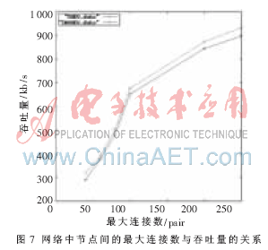 图7是最大节点移动速度为20 m/s时,网络中节点连接增加对网络吞吐量的影响。图中两个协议的吞吐量都随着网络中节点连接数的增加而增大。明显地,由于考虑了节点的移动速度,改进后的协议能够较快地捕捉节点间的断链情况,并做出较快的路由重建处理,使得图中IMAODV比AODV能产生较高的吞吐量。