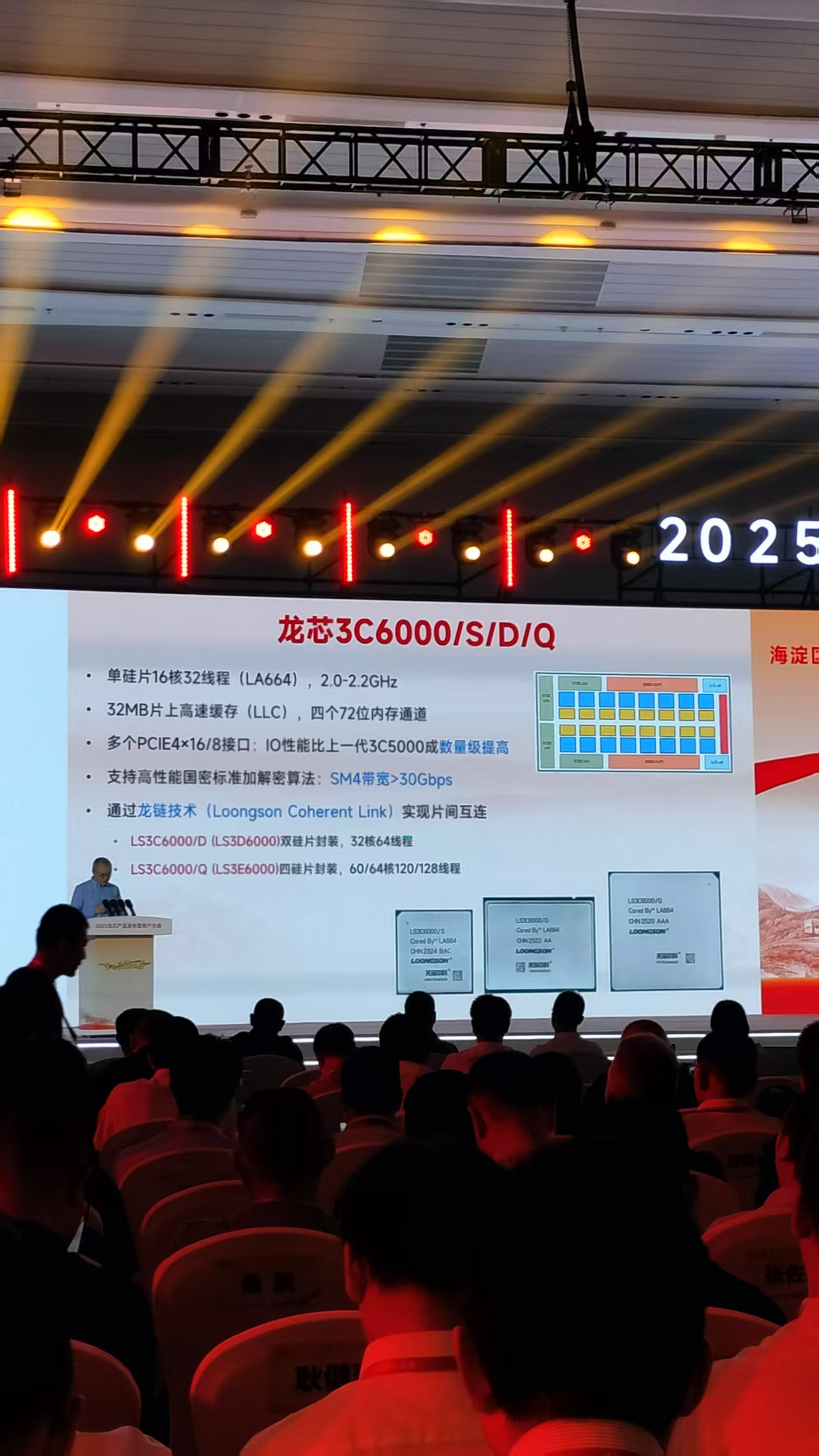 龙芯3C6000系列服务器CPU无疑是本次发布会的重头戏。在技术架构上,该系列芯片采用自主指令系统龙架构,基于第四代处理器核微架构设计,单硅片集成16个LA664处理器核,并且支持同时多线程技术,这一设计极大地提升了芯片的多任务处理能力。更令人瞩目的是,龙芯通过自主研发的龙链技术实现多硅片互连,可灵活形成32核64线程的3C6000/D(3D6000)及64核128线程的3C6000/Q(3E6000),能够满足通算、智算、存储、工控、工作站等多场景的计算需求。