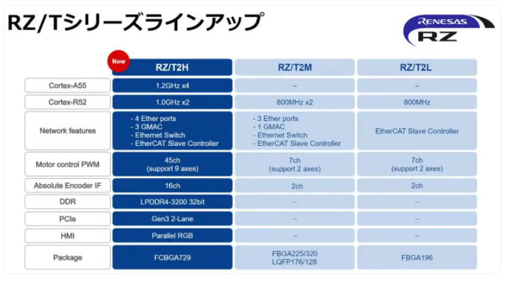 日本瑞萨电子此前量产面向工业设备的 MPU(微处理器单元)RZ / T2H,预计用于机器人等,号称 CPU 软件处理性能比以前提高了 20~30%。一个芯片可以同时控制最多 9 轴的电机。