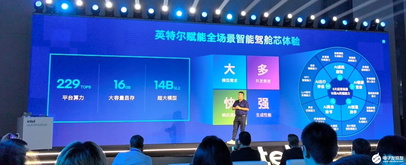 “英特尔dGPU算力高达229TOPS,集成16GB的DDR6的大容量显存。基于大算力、大容量显存,可以覆盖6B-14B参数模型区间。这些都为座舱带来了在舱内直接运行大模型的能力,这创造了很多可能性和新玩法。”英特尔公司中国区技术部总经理高宇表示。