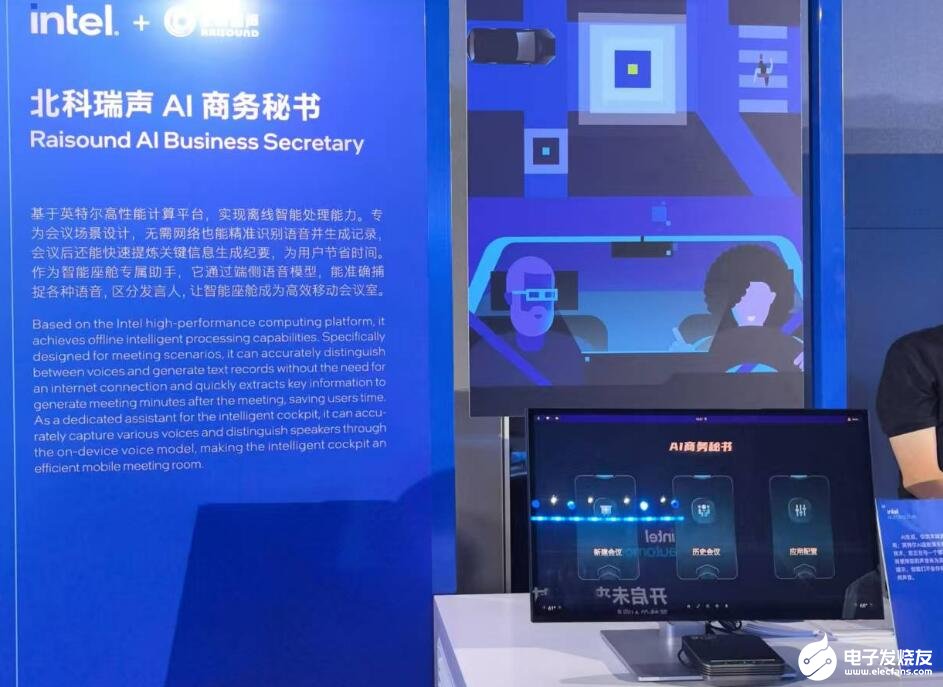 现场展示的北科瑞声AI商务秘书,基于英特尔高性能计算平台,实现离线智能处理能力,无需网络即能精准识别语音并生成会议记录。作为智能座舱助手,它通过端侧语音模型,能准确捕捉各种声音,区分发言人,让智能座舱成为高效移动办公室。