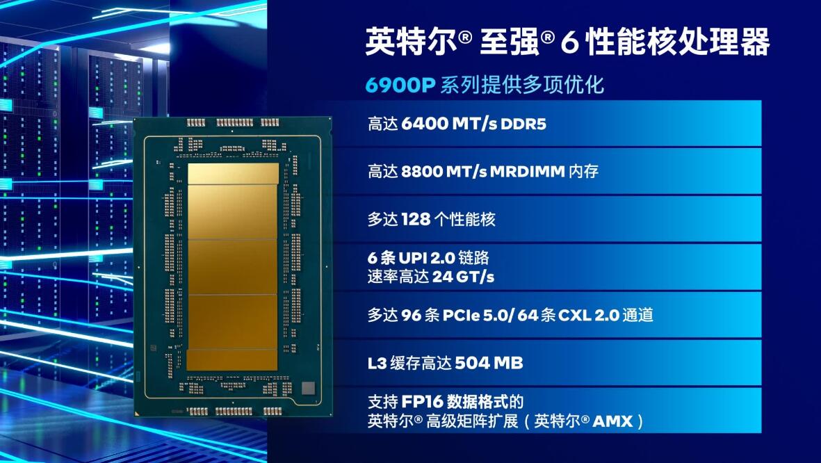 陈葆立介绍说,至强6900P系列处理器最高配备128个内核,支持高达每秒6400MT的DDR5内存、每秒8800MT的MRDIMM内存、6条UPI 2.0链路(速率高达每秒24 GT),96条PCIe 5.0或64条CXL 2.0通道。504MB的L3缓存,支持FP16数据格式的英特尔® 高级矩阵扩展(英特尔® AMX),可为AI和科学计算等内存带宽敏感型工作负载提供MRDIMM选择,且新增对CXL 2.0的支持。