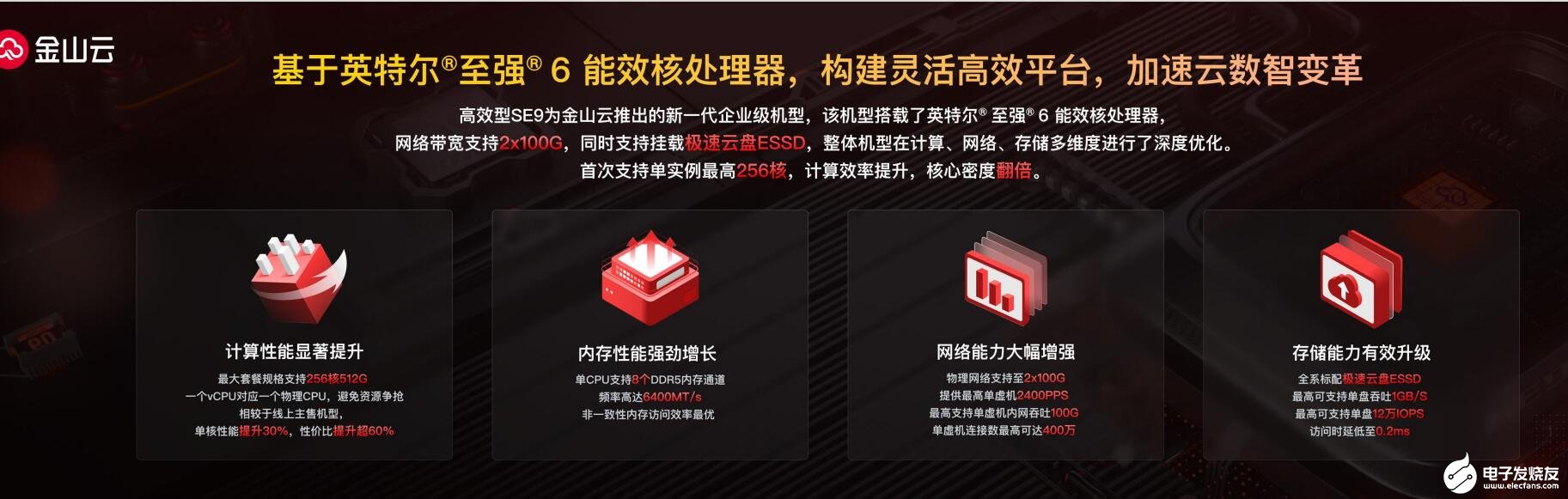 金山云高级副总裁刘涛表示:我们发布了搭载英特尔至强6能效核处理器的金山云第九代高效型云服务器SE9,网络带宽最多支持2*100G,首次单实例最高256核,计算效率提升,核心密度翻倍。该云服务器在计算、网络、存储等多维度进行了深度优化,可大幅提升核心密度及关键工作负载运行效率。”