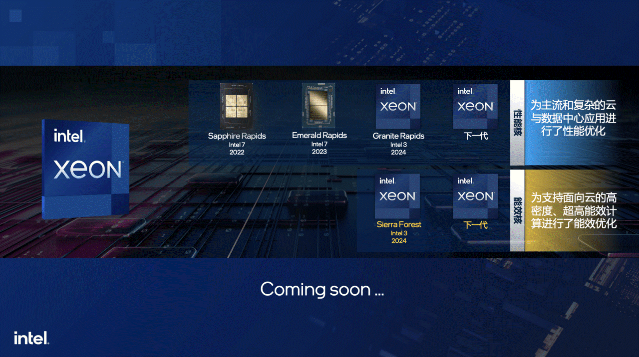 从路线图上来看,2024年英特尔还会发布新一代英特尔至强可扩展处理器,而且有一个非常丰富的产品组合,同时满足对性能和能耗的要求。基于现在的第五代至强,英特尔也会发布下一代的性能核,就是高主频、高性能的CPU核架构,为主流和复杂的数据中心的应用进行性能优化,尤其是目前有很多程序是跑在虚拟机上,之前写的非常大的程序要跑在性能核上的,才能看到一个非常好的性能提升。