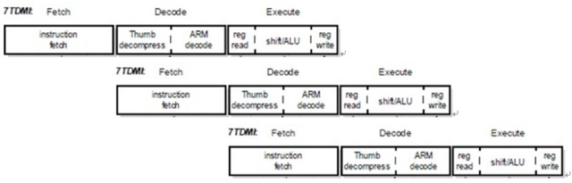 而对于ARMV7来说因为是3级流水线,所以把指令的处理分为了上面所述的3个阶段。
