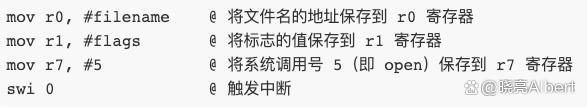 在 ARM 架构中,每一个系统调用都对应有一个系统调用号,比如open系统调用的号码就是5,应用程序通过 swi 指令从用户态切换到内核态,CPU进入特权模式,通过R7寄存器将中系统调用号传递给内核。下面是 open 系统调用的汇编代码示例: