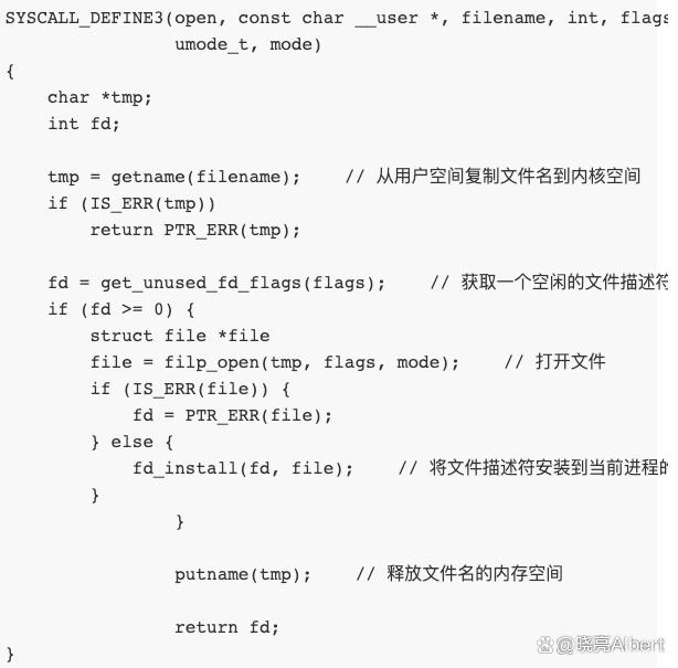 在内核中,copy_from_user() 和 copy_to_user() 函数用于从用户空间复制数据到内核空间和从内核空间复制数据到用户空间。对于 open 系统调用,它需要从用户空间复制文件名和标志,并将它们传递给 sys_open() 函数进行处理。下面是 sys_open() 函数的代码示例: