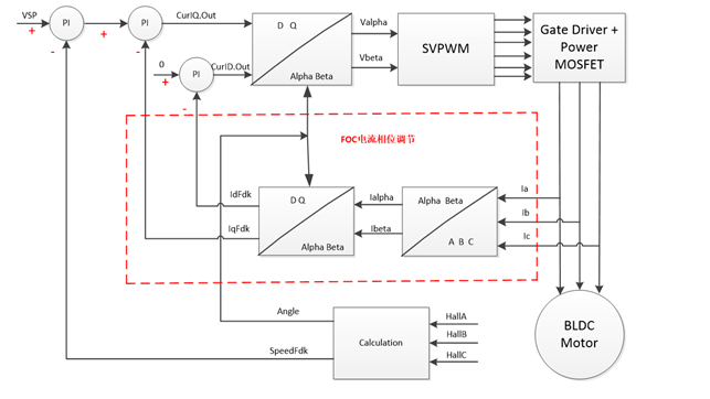 方案软件部分采用世平HALL FOC 双电阻采样的软件库架构,通过板载电位器使电机旋转,整个软件结构清晰易懂。软件采用双环控制(电流环+速度环),矢量控制的框图如下图所示: