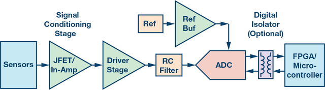 许多应用都要求采用精密数据采集信号链以数字化模拟数据,从而实现数据的精确采集和处理。精密系统设计师面临越来越大的压力,需要找到创新的办法,提高性能、降低功耗,同时还要在小型PCB电路板上容纳更高的电路密度。本文旨在讨论精密数据采集信号链设计中遇到的常见难点,探讨如何运用新一代16位/18位、2 MSPS、精密逐次逼近寄存器(SAR) ADC解决这些难点。