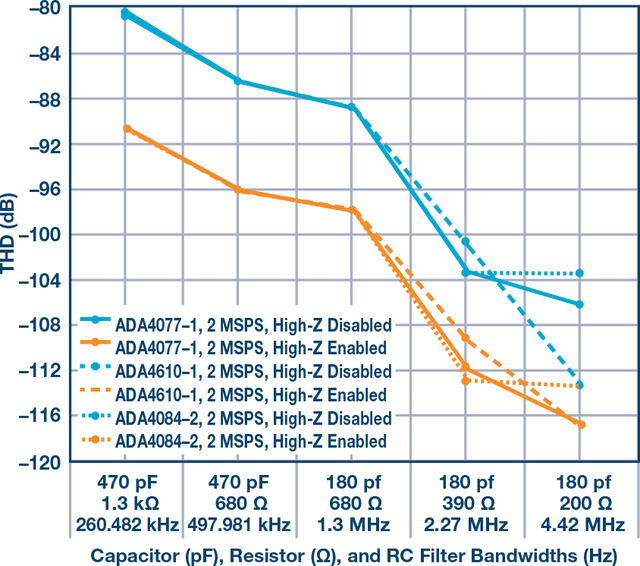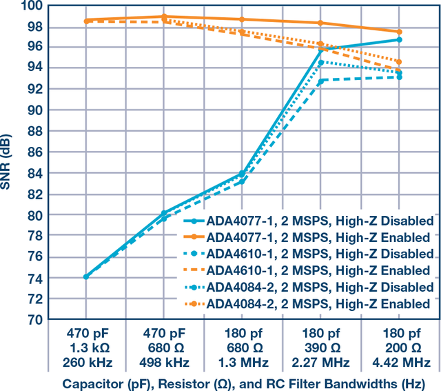 ADA4610 (IQUIESCENT = 1.5 mA/放大器) 精密放大器。在2.27 MHz RC带宽和1 kHz输入信号条件下使能高Z时,这些放大器可实现96 dB至99 dB的典型SNR以及优于–110 dB的典型THD。在使能高Z模式时,甚至在R值大于200 Ω时,THD约改善了10 dB。即使在超低RC滤波器截止频率条件下,最高SNR也接近99 dB。