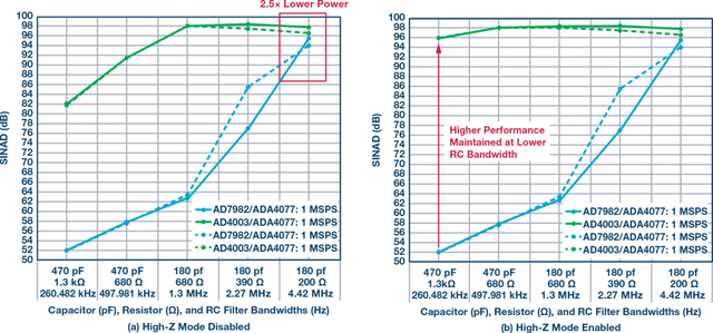 图7. 使用ADA4077和ADA4807时AD4003 ADC和AD7982 ADC放大器驱动器的比较:在禁用和使能高Z模式时的SINAD与RC带宽(FS = 1 MSPS, fIN = 1 kHz)。