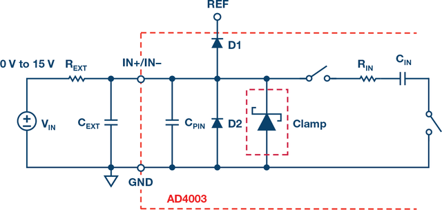 当模拟输入超过基准电压~400 mV时,AD4000/AD4003 ADC的内部箝位电路将开启,电流将通过箝位流入地,防止输入进一步升高而可能损坏器件。