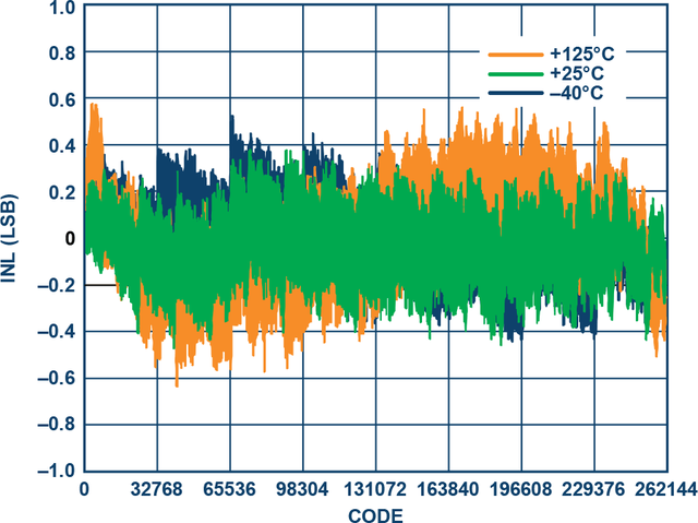 AD4000/AD4003 ADC采用1.8 V工作电压,在2 MSPS下的典型功耗为14 mW/16 mW,线性度非常出色,最大值为±1.0 LSB (±3.8 ppm),保证18位无失码。图11所示为AD4003 ADC的典型INL与代码性能。AD4003 ADC可在高达奈奎斯特的超宽输入频率范围内实现比AD7982 ADC更出色的SINAD性能(图12),使系统设计师能开发出带宽更宽、精度更高的仪器仪表设备。AD4000/AD4003 ADC采用小型10引脚封装(提供3 mm × 3 mm LFCSP和3 mm × 5 mm MSOP两种选项),与AD798x/AD769x ADC系列引脚兼容。
