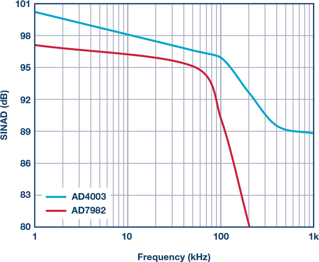 图12. AD4003 ADC和AD7982 ADC SINAD与输入频率的关系