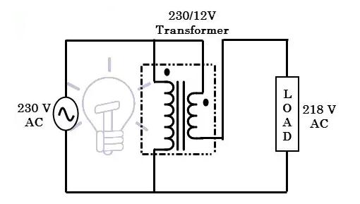 为了理解这个概念,让我们考虑230/12V额定值的简单降压变压器及其与这些操作的连接,如下所示。