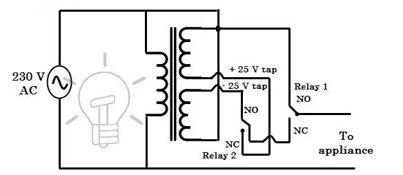 上图显示了两级稳压器,它使用两个继电器在过压和欠压条件下为负载提供恒定的交流电源。通过切换继电器,可以针对两种特定的电压波动(一种是欠压,例如195V,另一种是过压,例如245V)执行降压和升压操作。