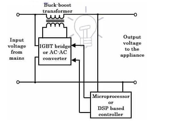 它主要由降压升压变压器、IGBT 功率转换器(或交流到交流转换器)以及微控制器、微处理器或基于 DSP 的控制器组成。微处理器控制的IGBT转换器通过脉宽调制技术产生适量的电压,并将该电压提供给降压升压变压器的初级。IGBT转换器产生电压的方式可以是同相或180度异相输入线电压,以便在波动期间执行加减电压。