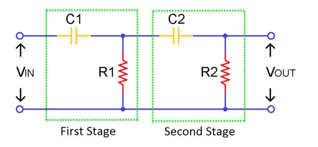 这是因为截止频率变化。与单级高通滤波器相比,它的效率更高,因为它有两个存储点。对于两级滤波器,截止频率取决于两个电容器和两个电阻的值。具体如下