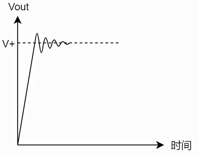上面的过程时间极短,产生一个振幅非常小并且振幅逐渐收缩的振荡,最终 Vout = Vin。在这个过程中 V+ 和 V- 的电压差逐渐减小,最终两者相等。