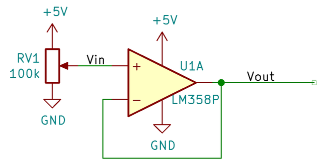 如果将一个可调电阻接到运放跟随器的同相输入端,调整其电压,可以看到输出电压一直会跟着输入变大或变小,并且始终相等: