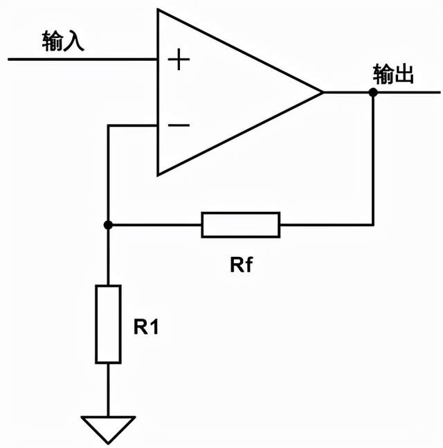 电压跟随器将输出信号完整的反馈到输入引脚,如果使用一个电阻分压网络将输出电压的一小部分反馈到输入引脚,则会造成放大的效果。电路图如下: