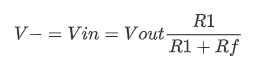 由分析方法 2 我们知道:运放总是会竭尽所能维持两个输入引脚电压相等,即 V+=V-。Rf 和 R1 组成电阻分压网络,如果我们知道 V- = Vin,根据电阻分压公式:
