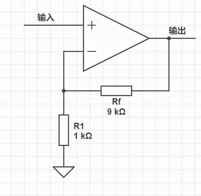 上面电路中放大倍数为 10 倍。如果输入为 1V, 则输出为 10V。