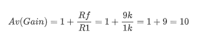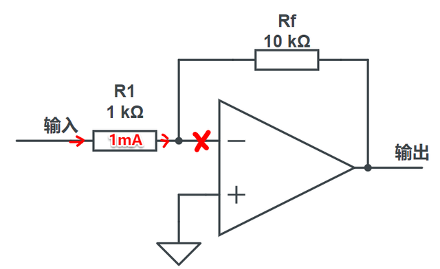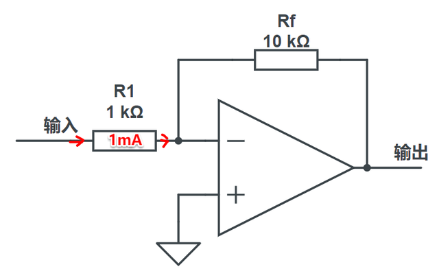 假设输入电压 Vin = 1 伏,R1 = 1kΩ,Rf = 10kΩ。由欧姆定律可知流过 R1 的电流为:1V/1k = 1mA: