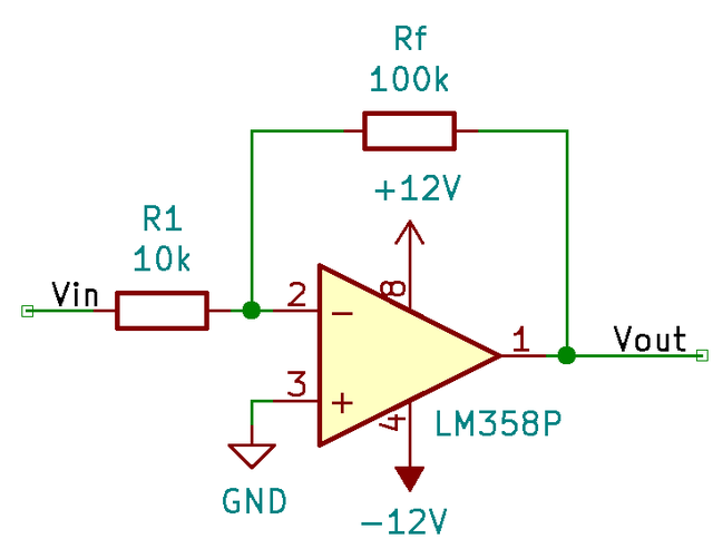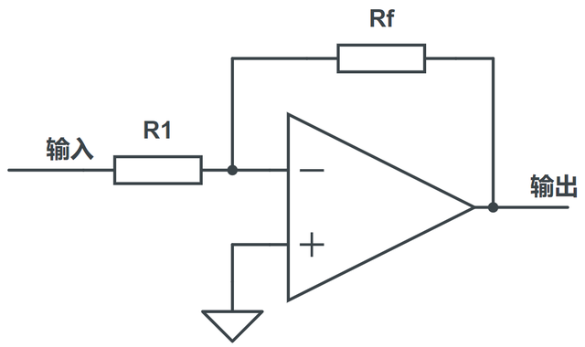 同相放大器的输入信号从同相输入引脚 V+ 进入,输出信号和输入信号是同相的。如果将输入信号从反相引脚输入,则会构成反相放大器,电路图如下: