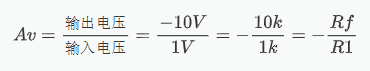 由欧姆定律可知,Rf 两端的压降等于 1mA*10k = 10V。电阻 Rf 左边虚地,电压为 0 伏, 那么其右边电压就为 -10 伏。也就是说输出电压为 -10 伏。