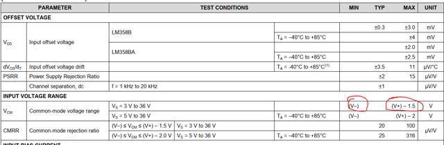 LM358 数据手册中有一项是 共模输入电压范围(Common-mode voltage range) :