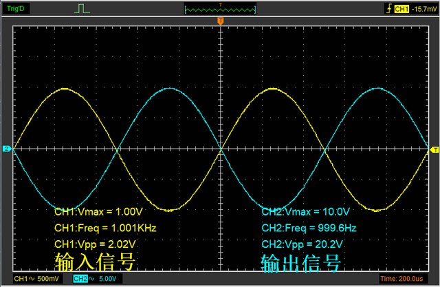 2 伏峰峰值正弦波输入,20 伏输出,放大 10倍。它是一个反相放大器,输出正好相差 180 度,所以是上下颠倒的。
