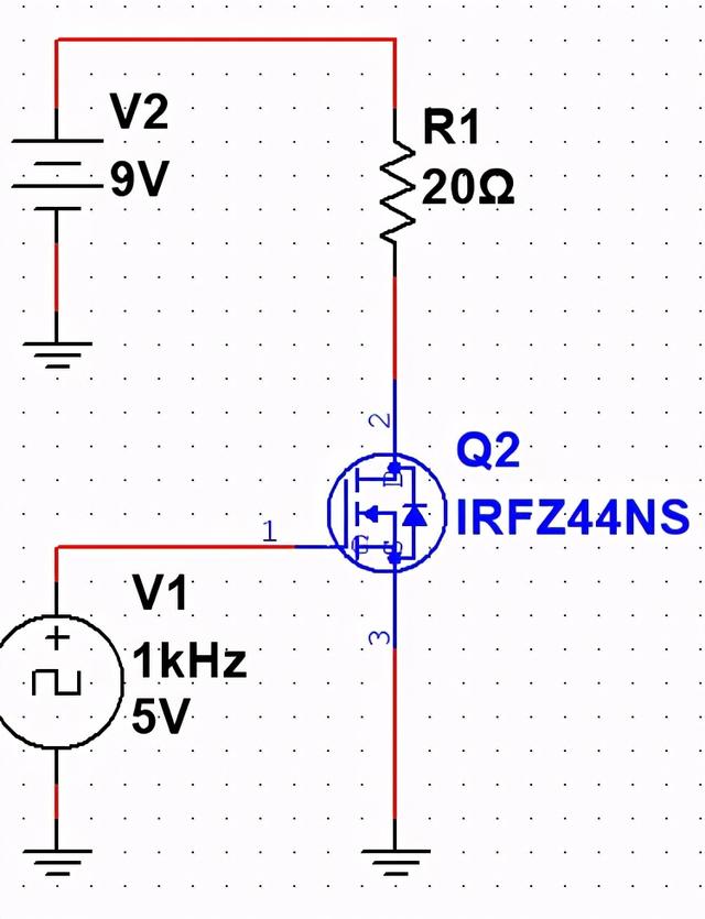 让我们从一个简单的电路开始,该电路使用一个 N 沟道场效应管控制 20 欧姆所在电路的通断。换句话说,我们拿场管当开关用。