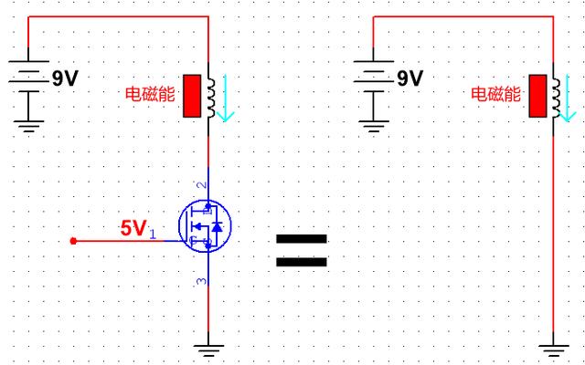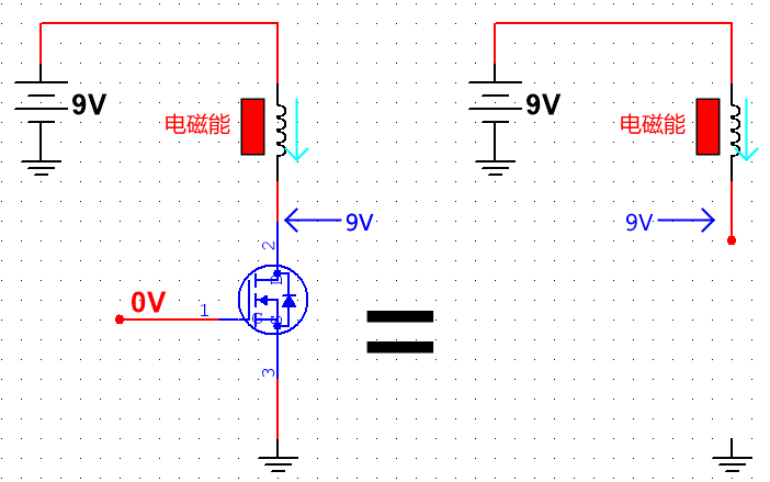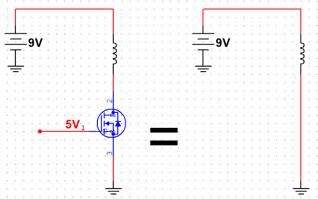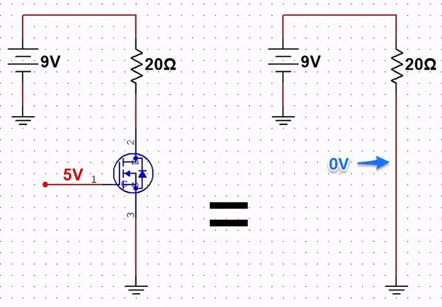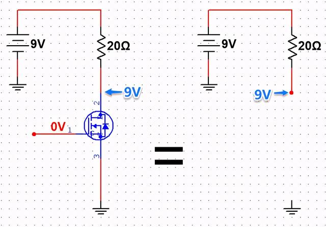 当给 N 沟道场效应管门级施加低电压,这里是 0 V 时,电路断开,等效电路如下图所示: