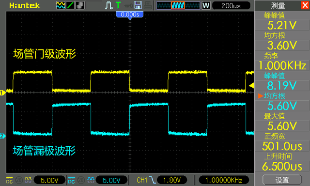 可以看到,当给场管门级施加高电平时,电路导通,场管漏极与地短接,电压为0; 当给场管施加低电平时,场管断开,场管漏极电压等同于电源电压9V(实际 8.19 V, 电池电量可能不够了)