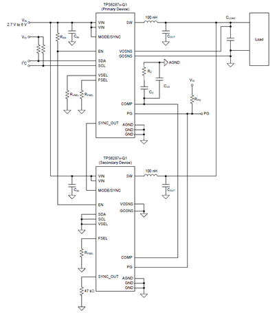 图 1:采用堆叠配置的两个 TPS62876-Q1 器件