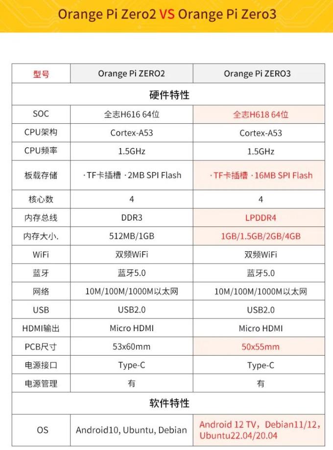 Orange Pi Zero 3比起经典款Zero 2,Zero 3将处理器从H616升级到H618,运行内存从512MB/1GB两种可选升级到1GB /1.5GB/2GB/4GB四种可选,更大的运行内存令软件运行时有更快的速度和更好的流畅度。在外观上,Zero 3尺寸更小,仅有50mm*55mm,只有一张信用卡的2/3那么大,可以轻松塞到各种小巧的产品模具里。