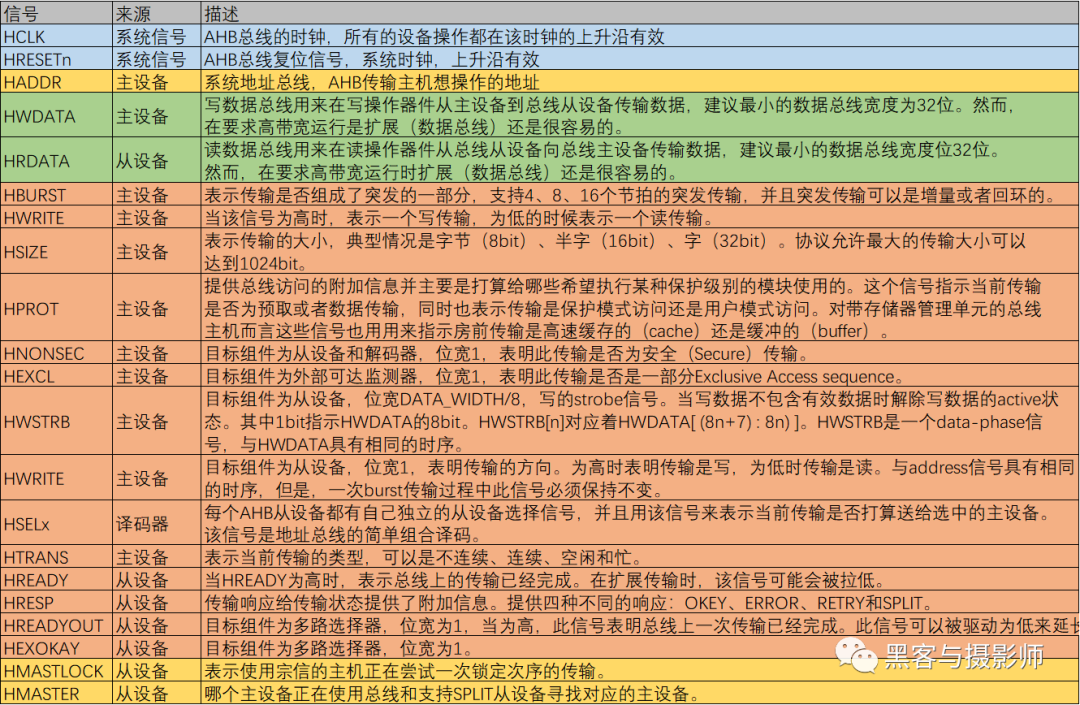 AHB是一种高性能、高时钟频率的AMBA总线协议。主要用于连接RAM、DMA、Bridge等高速设备。主要支持如下特性:burst传输、Split事务处理、单周期master移交、流水线操作、支持多个总线主设备。