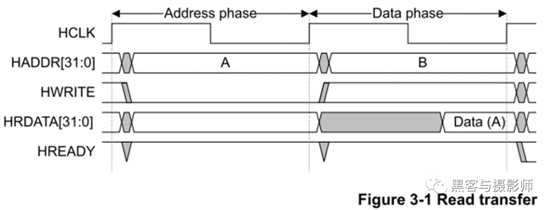 上图是没有等待状态的简单传输的时序图,所以此传输包含一个地址周期和一个数据周期。3.1为读传输,3.2为写传输。在这个没有等待状态的传输中: