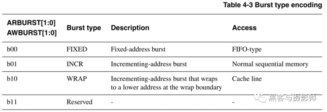 同理,AxBURST为ARBURST和AWBURST的统称,分别表示读操作、写操作burst类型。