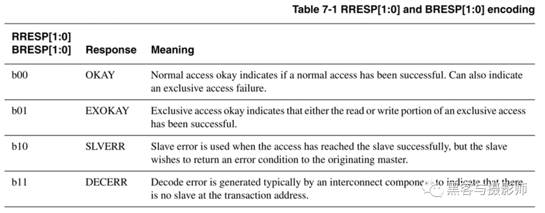 上面分析地址结构、数据结构,接下来介绍一下响应类型,BRESP、RRESP分别表示写响应、读响应,后面统一使用xRESP表示,具体的译码规则如下: