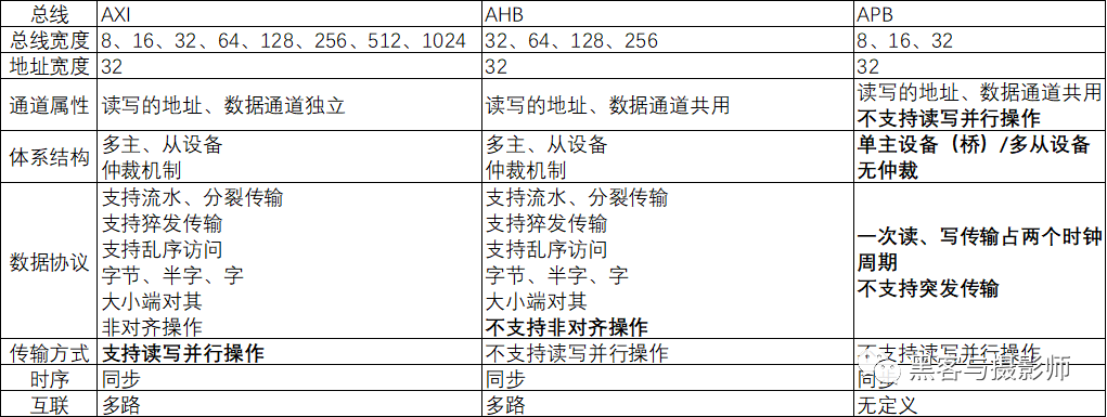 AXI:高速度、高带宽、管道化互联、单向通道,只需要首地址、读写并行、支持乱序、支持非对齐操作,但连线非常多。