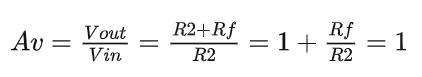 在这种同相电路配置中,输入阻抗Rin增加到无穷大,反馈阻抗Rƒ减小到零。输出直接连接回负反相输入,因此反馈为 100%,Vin恰好等于Vout,为其提供固定增益1或 1。当输入电压Vin施加到非反相输入时,放大器的电压增益因此给出为: