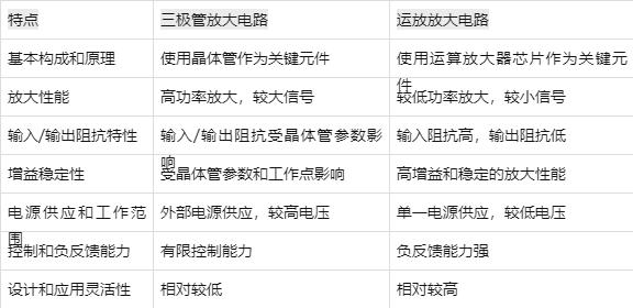 以下是关于三极管放大电路和运放放大电路的区别的简要总结表格: