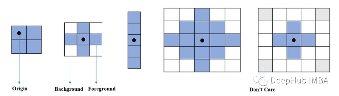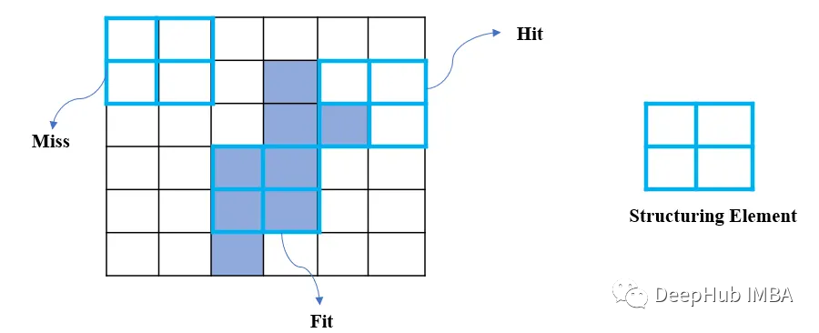 Miss:如果图像中没有一个像素与结构元素匹配,则称为Miss。