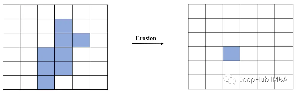 1、Erosion 侵蚀 ,也被翻译成腐蚀:结构元素对对象的每个像素进行卷积。如果结构元素的所有像素与目标图像像素重叠(满足Fit条件),则将目标图像像素填充前景像素强度值。否则,将填充背景像素强度值。
