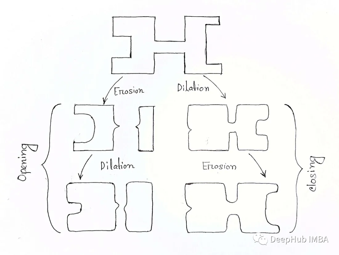 可以看到,开操作Open先对图像进行腐蚀操作,然后再进行膨胀操作的组合过程,可以用于消除小的物体或细节,并且可以平滑物体的边界